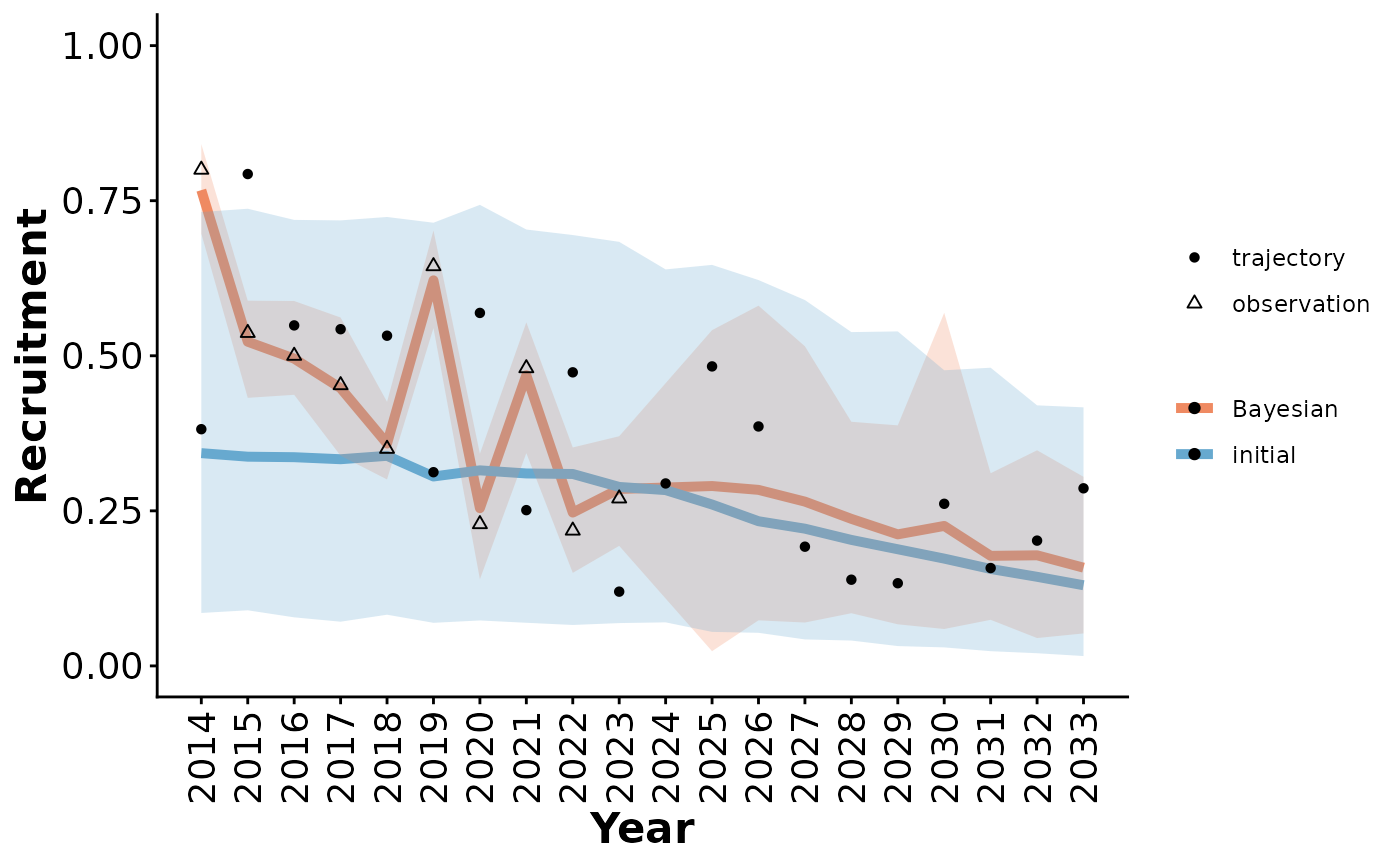 out <- bayesianTrajectoryWorkflow(surv_data = simO$simSurvObs, recruit_data = simO$simRecruitObs,